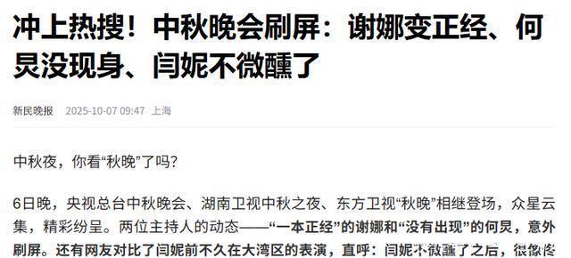 参考链接 新民晚报:(冲上热搜!中秋晚会刷屏:谢娜变正经、何炅没现身、闫妮不微醺了2025.10.07)